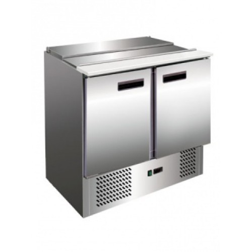 Холодильник-рабочий стол для салатов (саладетта) "мини", экономичная версия, 2 дверцы, 2 полки-решетки GN 1/1 с направляющими, охлаждаемое гнездо с крышкой, разделочная доска из пластмассы, материал корпуса снаружи - нерж.сталь 304/430, внутри - алюминий