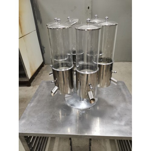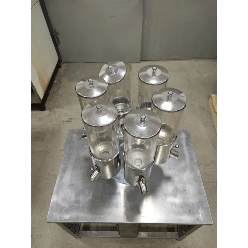 Диспенсер для сыпучих продуктов на 6 емкостей, б/у. Массивная станина, вращение бункеров, дозатор на каждом бункере. Объем одного бункера 4л. Емксоти из оргстекла.