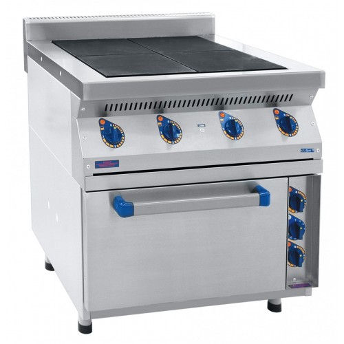 Чугунные конфорки в качестве нагревательных элементов оснащены тремя ТЭНами, что обеспечивает быстрый и равномерный нагрев, а также гарантирует долгий срок эксплуатации конфорок. 7-позиционные пакетные переключатели позволяют производить плавную регулировку мощности конфорок. Площадь конфорок - 0,36 кв.м. Конфорки образуют ровную поверхность, что обеспечивает удобное и легкое перемещение наплитной посуды. Внизу - жарочный шкаф с двумя или тремя противнями размером 530х470 мм, изготовленных из черной стали. Духовка имеет раздельную регулировку мощности верхнего и нижнего блоков ТЭНов. Рабочий диапазон температуры духовки 20-270 С, установленный аварийный терморегулятор предохраняет шкаф от перегрева 320 С. Плита имеет регулируемые по высоте ножки. Боковые панели выполнены из крашеной стали.