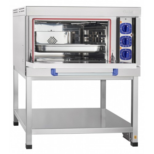 Духовка укомплектована 2-мя гастроемкостями GN 1/1 размером 530x325x65 мм и одной решеткой размером 530х650х65 мм, изготовленными из нержавеющей стали. Раздельная регулировка мощности верхнего и нижнего блоков ТЭН-ов. Рабочий диапазон температуры 20-270°С, установленный аварийный терморегулятор предохраняет шкаф от перегрева свыше 320°С. Возможность принудительной конвекции и пароувлажнения. Все элементы конструкции, в том числе и сама рабочая камера, изготовлены из нержавеющей стали. Регулируемые по высоте ножки.